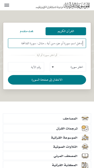87%موسوعة القرآن الكريم الشاملة، تحتوي على الباحث القرآني، وتفسير القرآن الكريم، وترجمة القران، و المكتبة الصوتية للقرءان الكريم
