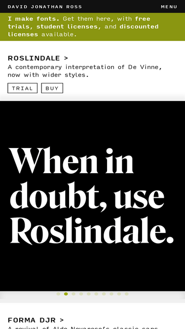 92%The type foundry of David Jonathan Ross (DJR), home of the Font of the Month Club. Making fonts such as Fit, Forma DJR, Gimlet, Manicotti, Input, Turnip, Condor, Trilby, Fern, and Output.