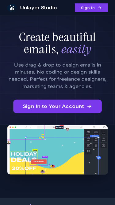 78%Unlayer is an email editor and page builder to build beautiful, responsive designs quickly and easily. Use it online or embed it into your application.