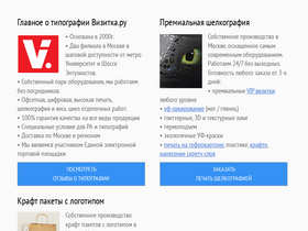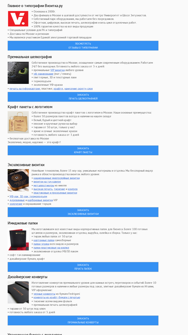 99%типография визитка.ру – это собственное производство в москве, качественная печать, сжатые сроки. шелкография. тиснение. термоподъем. уф лакирование. продукция: бумажные пакеты, крафт пакеты, папки, визитки, блокноты, каталоги и брошюры, нанесение скретч-слоя и многое другое. доставка по москве.