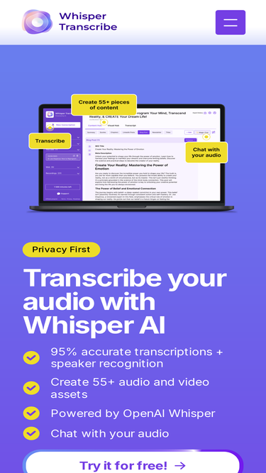 85%Turn any podcast or YouTube video into a blog post automatically with WhisperTranscribe. Join 7000+ users and try it for free now.