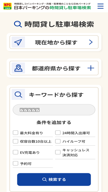 全国の駐車場検索ができます。駐車料金、収容台数、最大料金、満空情報など多彩な項目から検索することが可能です。