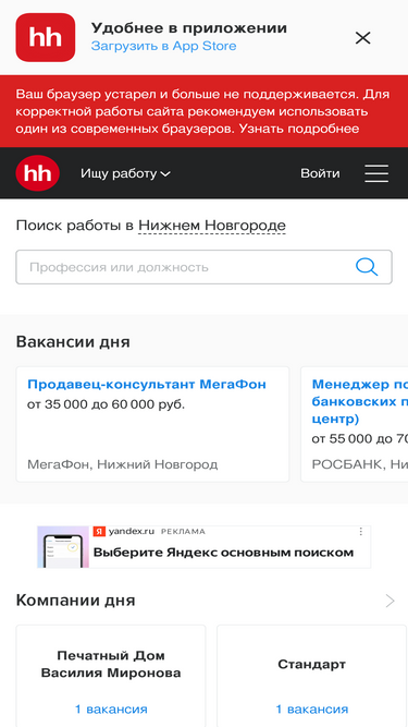 57%nn.hh.ru — сервис, который помогает найти работу и подобрать персонал в Нижнем Новгороде более 20 лет! Создавайте резюме и откликайтесь на вакансии. Набирайте сотрудников и публикуйте вакансии.