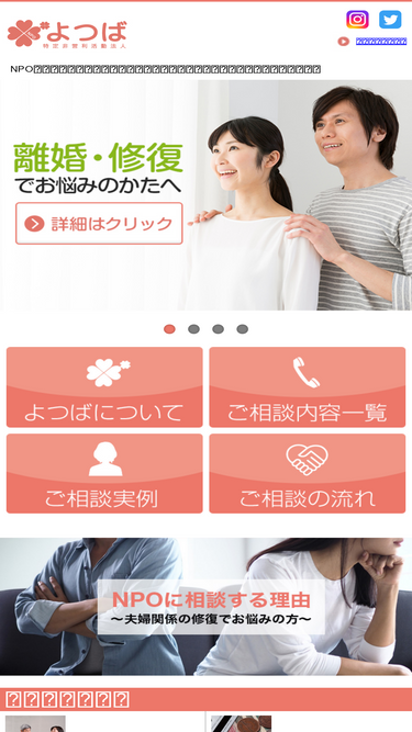 浮気・不倫に関するご相談や、夫婦関係修復等「npo法人よつば」では、専門カウンセラーが様々な問題を解決するためのお手伝いをしています。その他にも、ストーカー被害や金銭トラブルに関するご相談を電話やwebにて、無料で承っております。