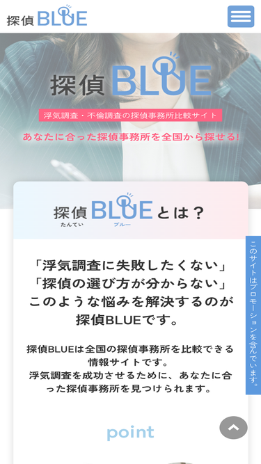探偵BLUEは浮気調査・不倫調査を専門とした探偵事務所・興信所を比較できるポータルサイトです。全国の地域から、あなたに合った安心の探偵事務所を見つけられます。