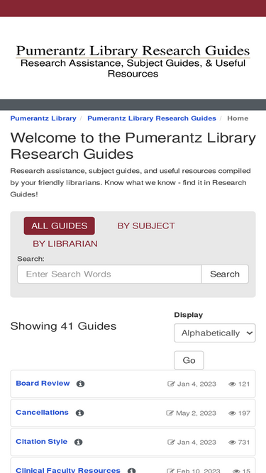 82%Welcome to the Pumerantz Library Research Guides Research assistance, subject guides, and useful resources compiled by your friendly librarians. Know what we know - find it in Research Guides!