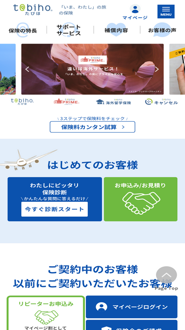 87%法人(企業)向け海外旅行保険「コーポレートt@bihoたびほ」はリスク細分型、インターネット専用の海外旅行保険です。海外出張や駐在が多い法人向け。企業包括契約や海外渡航時の随時個別契約の見直しをされてる企業様は必見です。企業様の保険料コスト削減や業務効率化に貢献します。