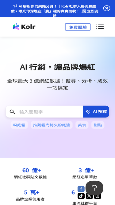 100%Kolr 透過強大 AI 網紅數據資料庫,爬梳資料並剖析網紅社群數據,提供最深入的網紅行銷趨勢及 KOL 洞察報告,為廣告主及行銷人在快速迭代的時代,精準指引網紅數據與社群趨勢,立即免費下載!