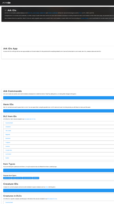ark ids features complete, updated lists of all item ids, creature ids and location coordinates for the ark: survival evolved game and its dlcs on pc, xbox and ps4.