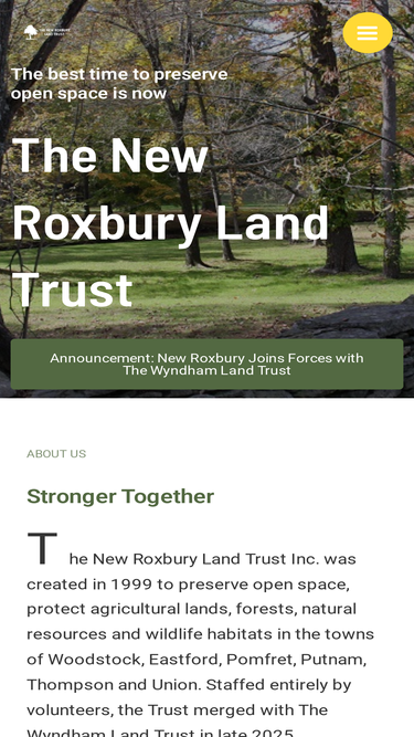 the new roxbury land trust inc., is a private, local, nonprofit organization in northeastern connecticut. it was created in 1999 to preserve open space; protect agricultural lands, forests, natural resources and wildlife habitats; and encourage the use of conservation easements and rights of way in the towns of woodstock, eastford, pomfret, putnam, thompson and union. the trust is staffed entirely by volunteers.