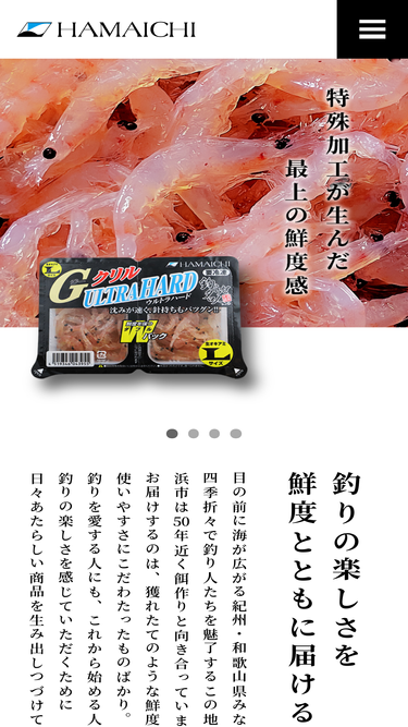 100%紀州・みなべ産 総合釣り餌メーカー 株式会社 浜市のオフィシャルサイトです。株式会社浜市の釣り餌は釣りのメッカ「紀伊半島」から全国へお届けしています。 オキアミ、アミエビ、その他のエビ類等、お客様のニーズに応じた各種海釣り餌を全国へお届けしています。