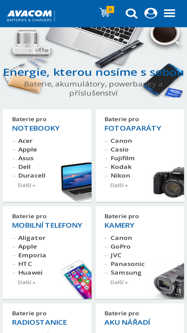 85%avacom.cz nabízí baterie do notebooků, mobilů, videokamer, fotoaparátů, pda, aku nářadí, radiostanic a spotřebitelské nabíjecí baterie aa, aaa a další.