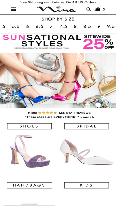 View the largest assortment of Nina Shoes styles and colors. Nina features footwear, shoes, sandals, pumps, wedges and boots for evening, special occasions, wedding, bridal, date nights, prom and every day wear. Nina shoes has a large selection of kids shoes for girls. Free Shipping available.