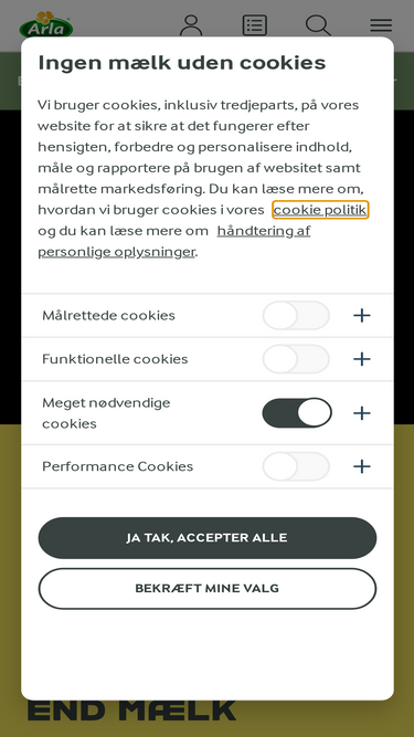 Velkommen til Arla.dk. Her finder du hele vores produktsortiment og mere end 3.000 lækre opskrifter fra Arlas Inspirationskøkken.