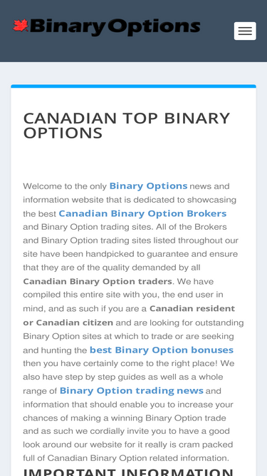 Canadian Binary Options is packed full of guides, news and plenty of Binary Option site reviews plus Bonuses to give away to Canada based traders. Binary Options Canada has the official Free Bonus for new accounts and match 100% of your deposit.