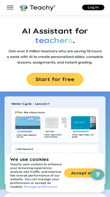 Sumali sa milyun-milyong guro na nakakatipid ng oras gamit ang pinakakumpleto at pinakamamahal na plataporma ng AI para sa mga edukador, na idinisenyo upang tumulong sa paggawa ng mga plano ng Aralin, mga natatanging tanong, Aktibidad mula ika-1 hanggang ika-9 na Antas ng Baitang ng elementarya, lahat ng high school, at marami pang iba.