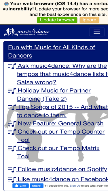 music4dance.net is an online music catalog, tool and educational resource to help ballroom, salsa, swing, tango and other dancers find fun and exciting music.