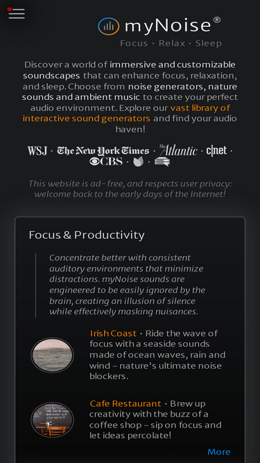 98%mynoise sets the standard for online background noise machines and interactive soundscapes.