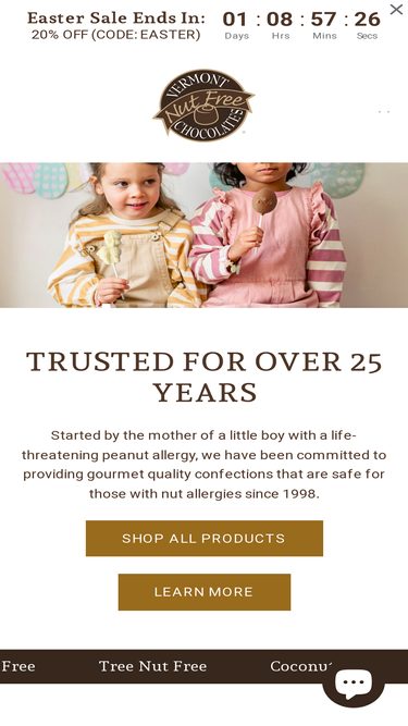 Fine, artisan chocolates made in a dedicated peanut and tree nut free facility. Our selection of sweets is guaranteed safe for anyone with a nut allergy.
