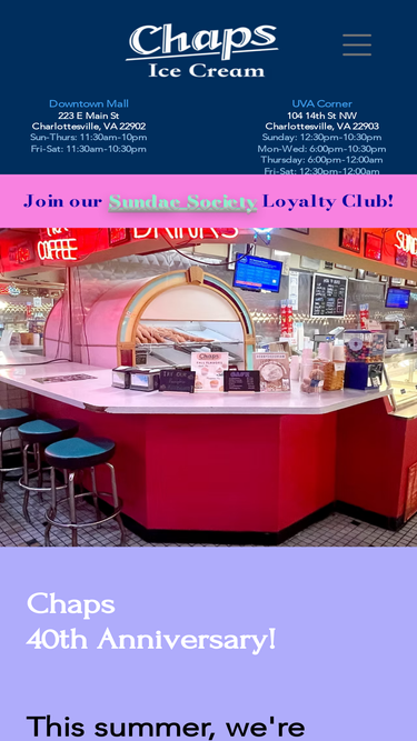 A cornerstone of the downtown mall, Chaps Ice Cream has been serving the Charlottesville community for over 35 years with passion and love. All of our gourmet Ice Cream is homemade on the premises.