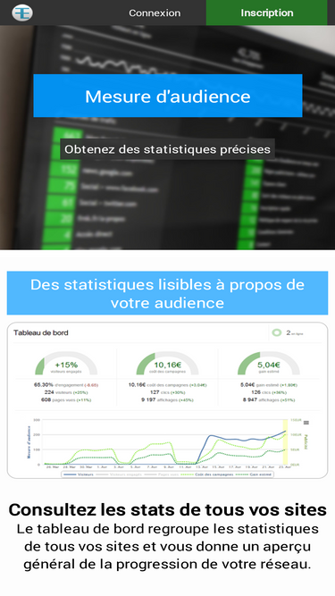 72%service évolué de mesure d'audience de site internet, audiscope analyse l'audience de votre site et vous explique comment exploiter les résultats pour optimiser son efficacité. très simple d'utilisation et très abordable, il est particulièrement adapté au pme/pmi. audiscope propose également une offre spécifique aux webagencies et agences de communication.