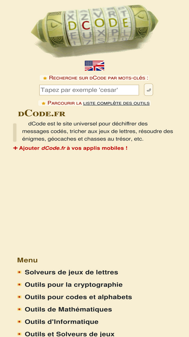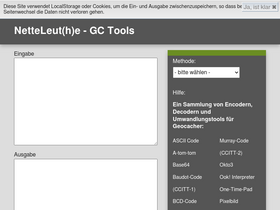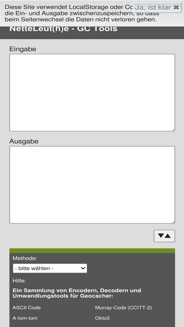 100%ein sammlung von encodern, decodern und umwandlungstools für geocacher: ascii code, a-tom-tom, base64, baudot-code (ccitt-1), bcd-code, beatnik, bifid, binär-code, brainfuck interpreter, buchstabenhäufigkeit, buchstabenwert, cäsar verschiebechiffre, cow interpreter, decabit impulsraster, four-square, handy, klopfcode, koordinatenschnitt, morse-code, murray-code (ccitt-2), okto3, ook! interpreter, one-time-pad, pixelbild, playfair, pocket-decoder, primzahlen-alphabet, ragbaby, reverse wherigo solver, römische zahl, rot13, rot18, rot47, rot5, scrabble-wert, skytale, tapir substitution, vigenère