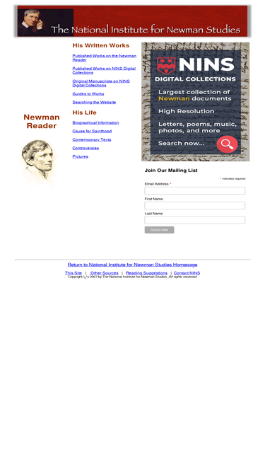 newman, john henry, his works and his life integrated in one website. current contents: 10 volumes of sermons; d evelopment of doctrine; letters and diaries; anglican difficulties; position of catholics; apologia; dream of gerontius; letter to pusey; letter to norfolk; life of cardinal newman (ward); etc.