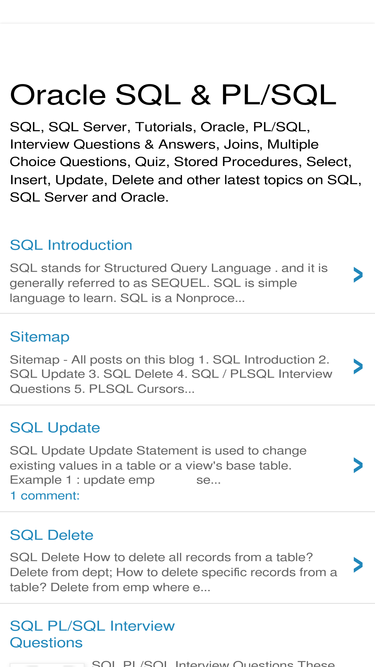 sql, sql server, tutorials, oracle, pl/sql, interview questions & answers, joins, multiple choice questions, quiz, stored procedures, select, insert, update, delete and other latest topics on sql, sql server and oracle.