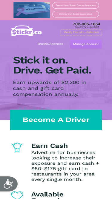 stickr is a vehicle advertising company that connects drivers and business for out of home advertising. drivers choose a brand to advertise on their car and stickr creates and ships a custom decal made for the back window of the car. verified drivers follow their normal routine and earn extra money and gift cards each month.