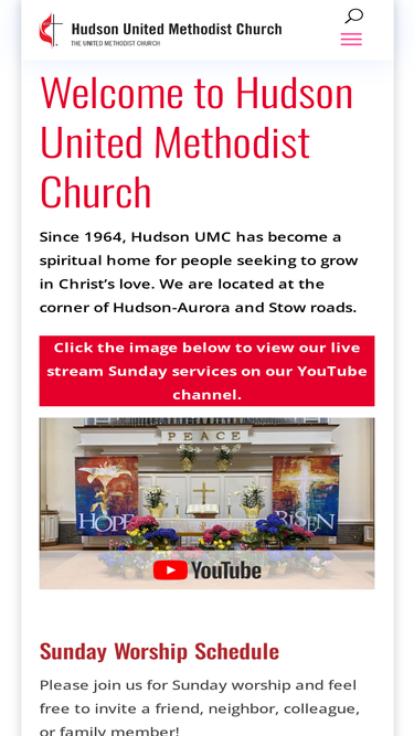 since 1964, hudson umc has become a spiritual home for people seeking to grow in christ’s love. we are located at the corner of hudson-aurora and stow roads. come as you are, all are welcome. our small groups meet in adult, youth, and children’s sunday school classes, and additionally, we invite all to women’s and men’s bible study, fellowship circles meeting on weekdays and evenings, and youth group sunday evenings. every summer we offer vbs (vacation bible school) a week of fun and learning for children. we provide ongoing service to open m and feed my sheep ministries in akron, habitat for humanity of summit county, work trips to puerto rico and overseas, and each year we take youth and adults to repair homes in appalachia with appalachian service project (asp). we find strength and spiritual growth within our many small groups for bible study, fellowship, and service through mission as we reach out beyond our building and serve together.