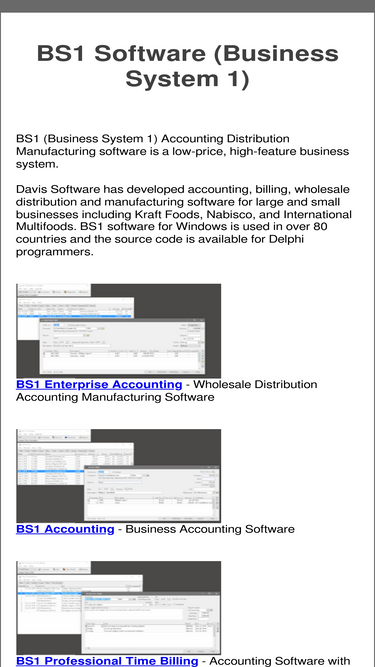 100%bs1 (business system 1) accounting distribution manufacturing software is a low-price, high-feature business system developed by davis software.