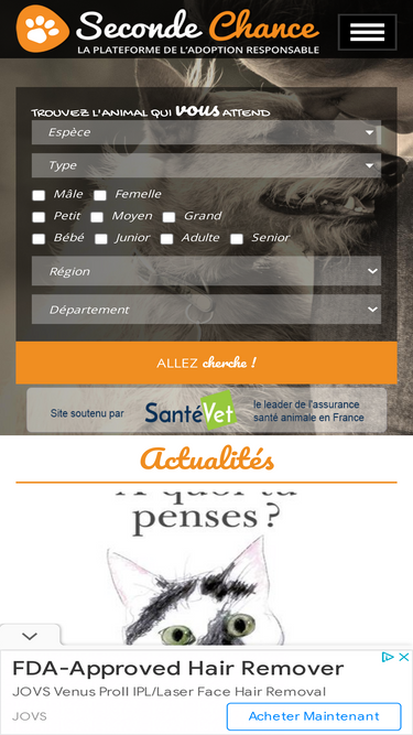 Adopter un chien ou adopter un chat dans les refuges de France avec Seconde Chance, qui centralise les annonces des refuges de France pour vous permettre de trouver votre chien, chat, rongeur ou autre animal de compagnie.