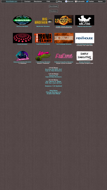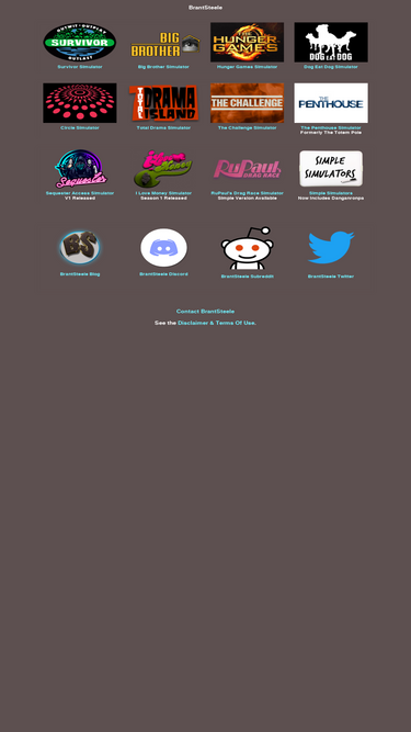 73%contains a collection of simulators created by brant steele including the survivor, big brother, hunger games, dog eat dog, and circle simulator.