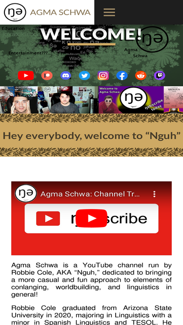 Agma Schwa is a YouTube channel run by Robbie Cole, AKA "Nguh," dedicated to bringing a more casual and fun approach to elements of conlanging, worldbuilding, and linguistics in general!