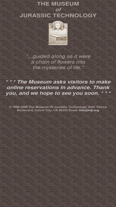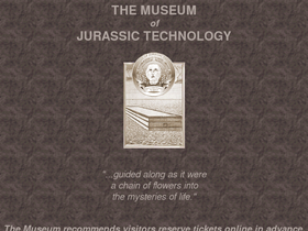 65%the museum of jurassic technology in los angeles, california is an educational institution dedicated to the advancement of knowledge and the public appreciation of the lower jurassic. like a coat of two colors, the museum serves dual functions. on the one hand the museum provides the academic community with a specialized repository of relics and artifacts from the lower jurassic, with an emphasis on those that demonstrate unusual or curious technological qualities. on the other hand the museum serves the general public by providing the visitor a hands-on experience of "life in the jurassic".