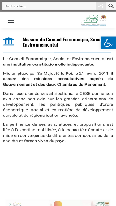 Le CESE est une institution constitutionnelle indépendante. Mis en place par Sa Majesté le Roi Mohammed VI le 21 février 2011, il assure des missions consultatives sur les grandes orientations de développement, les politiques publiques d’ordre économique, social et en matière de développement durable et de régionalisation avancée.