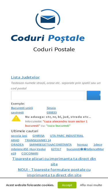 Cod Postal Romania - Zip Code Romania - Lista coduri postale din Romania. Cod postal, judet, localitate, strada. Bucuresti, Iasi, Cluj, Brasov, Prahova, Arges, Bacau.
