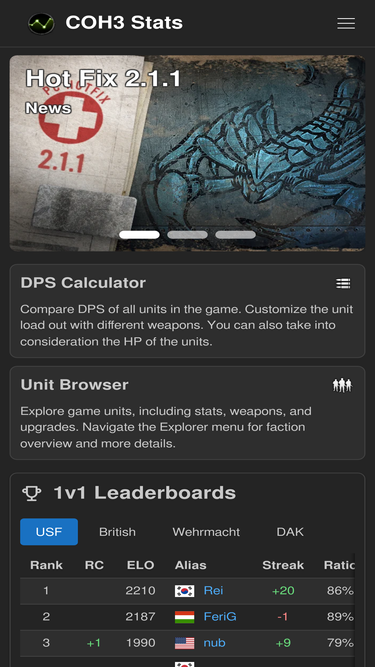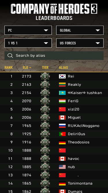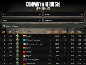 The Company of Heroes 3 Official Leaderboard provides real-time data, rank and statistics tracking. This includes results and rankings across all automatch modes. Track your stats, climb the ladder and compete with Company of Heroes players worldwide.
