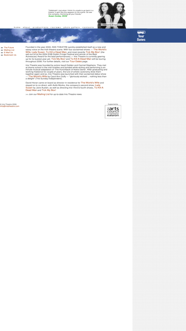 inis theatre was founded by actors iseult golden and carmel stephens in 2000. they met at drama school in the mid-nighties and bonded while writing and performing a six minute musical adaptation of 'the hunchback of notre dame'. after graduating and working freelance for four years, the lure of artistic autonomy drew them together again and so, inis theatre was launched with their acclaimed debut show - 'the world's wife' by carol ann duffy