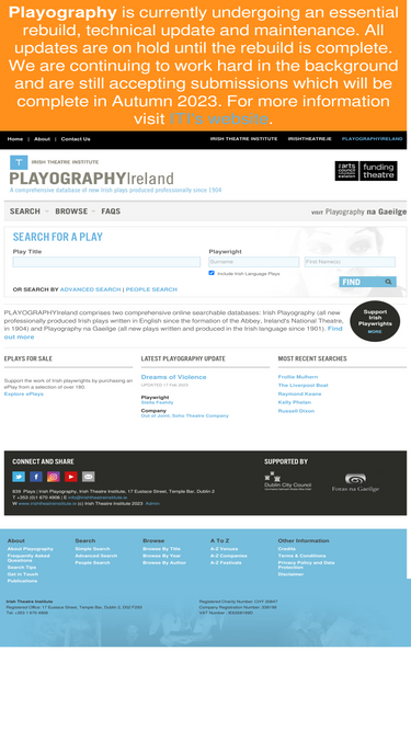 playographyireland comprises two comprehensive online searchable databases: irish playography (all new professionally produced irish plays written in english since the formation of the abbey, ireland's national theatre, in 1904) and playography na gaeilge (all new plays written and produced in the irish language since 1901).