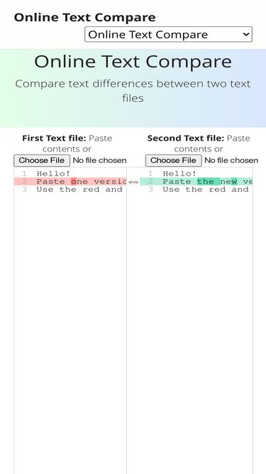 text compare! is an online diff tool that can find the difference between two text documents. just paste and compare.