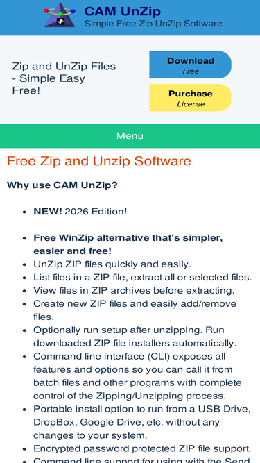 free zip software and unzip software program that lets you open, create, and modify zip files as well as list and unzip files in a zip archive. small download, easy install, simple graphical and command line interfaces and support for password protected encrypted zip files makes cam unzip perfect for novice and advanced users.