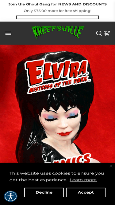 81%Kreepsville is the home of the original scare-wear range of horror, punk, psychobilly, and goth clothing and accessories. We carry officially licensed products featuring Elvira Mistress of the Dark, Vampira, Vincent Price, Bela Lugosi, and John Waters.