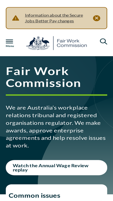 The Fair Work Commission is Australia's workplace tribunal. We create awards, approve enterprise agreements and help resolve issues at work.