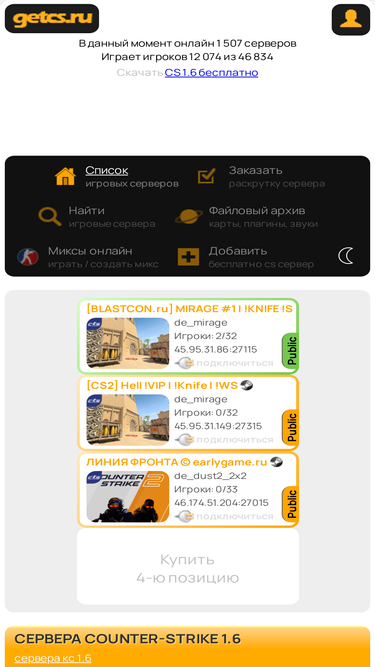 73%мониторинг серверов counter-strike. на главной странице популярные игровые сервера cs 1.6, cs source, cs go, cs 2