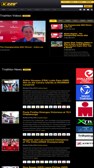 87%k226 triathlon provide the latest news, calendar of events, video and blogs on ironman, half distance and k226 triathlon as well as a index of professional athletes including blogs, rss, facebook and youtube references.