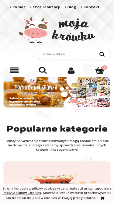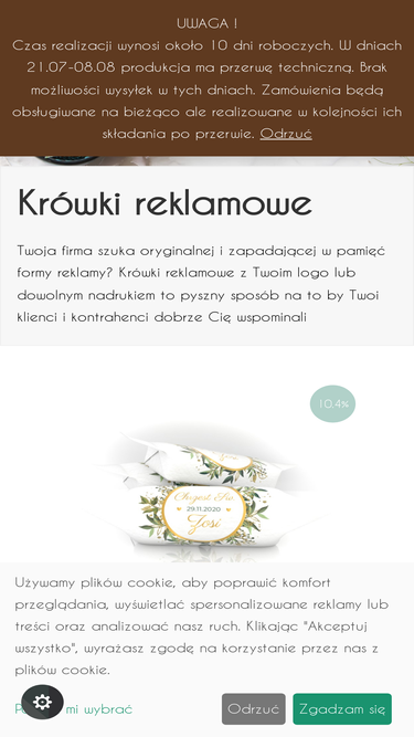 Proces realizacji zamówienia: Po otrzymaniu przesłanych materiałów i informacji (logo, teksty) potrzebnych do wykonania etykietki, nasz grafik tworzy indywidualny projekt do akceptacji, który zostanie przedstawiony drogą mailową. Następnie po akceptacji zamówienie trafia do produkcji. Informacje należy podać w formularzu zamówienia lub poprzez email po dokonaniu zamówienia w odpowiedzi na otrzymaną wiadomość z potwierdzeniem zamówienia: kontakt@krowki.sklep.pl. Dlaczego nasza krówka? Jest to tradycyjna krówka produkowana ręcznie według ponad 30 letniej receptury zapewniając bezkonkurencyjny smak. Nasze cukierki charakteryzują się delikatnym aromatem, którego nigdy nie ma się dosyć. Z tego względu zyskały wielu miłośników zarówno wśród dzieci, jak i wśród dorosłych – nie ma osoby, która byłaby w stanie odmówić ich skosztowania. Krówki produkowane są z pełnowartościowego mleka, dlatego oprócz wyśmienitego smaku, zawierają sporo wartości odżywczych. Wszystkie papierki zawijane są ręcznie, zaraz po tym jak schłodzona masa krówkowa trafia na stoły i zostaje ręcznie krojona. Zawinięte w papierki krówki wysyłane są świeże, dzięki czemu możesz rozkoszować się smakiem świeżej krówki, którego nie poznasz ze “sklepowej półki”! Świeżą krówkę cechuje miękka, ciągliwa konsystencja, przechodząca z czasem w delikatną kruchość i coś co powinna posiadać każda prawdziwa krówka - charakterystyczną „łezka” w środku. Fani kruchej krówki powinni mieć na uwadze, że od momentu wyprodukowania cukierki muszą odleżeć kilka tygodni zanim staną się całkowicie kruche, natomiast smakosze "ciągutek" mogą od razu delektować się fantastycznym smakiem świeżej krówki :) Przechowywanie w suchym i chłodnym miejscu powoduje, że cukierki dłużej zachowują swoją świeżą konsystencję. Norma: PN-A-88104. Skład: cukier, mleko, margaryna, syrop ziemniaczany, etylowanilina. Data przydatności to 3 miesiące. Oferujemy najlepsze krówki reklamowe z projektem graficznym, wykonanym przez nasze studio graficzne.