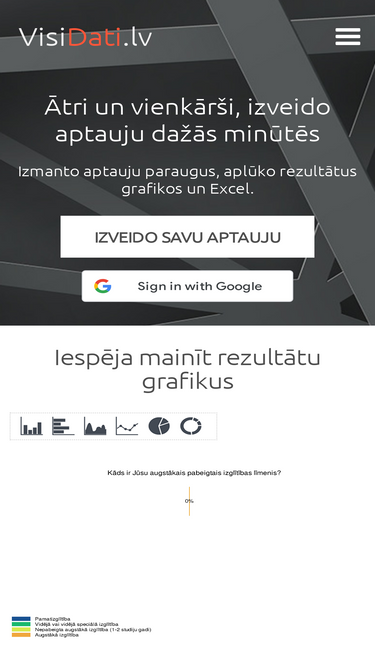 VisiDati.lv ir lielākais aptauju portāls Latvijā. Izveido bezmaksas aptauju ātri un vienkārši. Reģistrējies jau tagad!