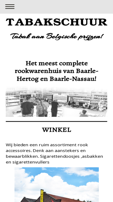 Voor een grote keuze aan verschillende Tabak soorten en rokers artikelen aan Belgische prijzen, moet U bij de tabakschuur in Baarle-Hertog zijn. U heeft ook de mogelijkheid om in te zetten op verschillende wedstrijden op onze machine van Bet First. Molenstraat 77a 2387 Baarle-Hertog, Graag zien wij U daar.