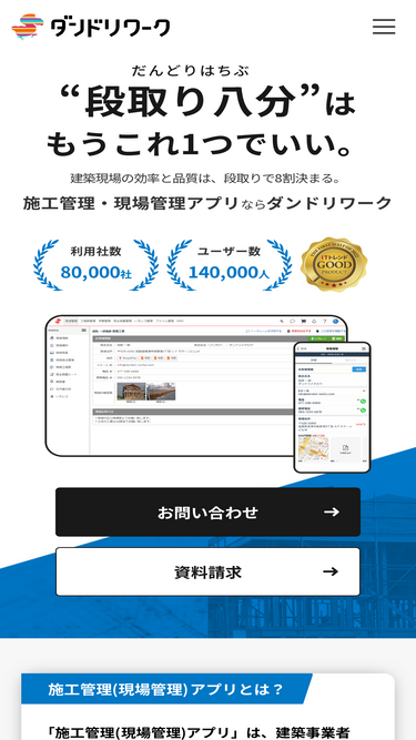 ダンドリワークは、生産性を高める建築業界に特化した現場管理アプリです。現場から生まれたダンドリワークには、施工管理に必要な機能がそろっています。業界出身者ならではの、徹底した導入サポート、運用継続のアフターフォローに自信があります。